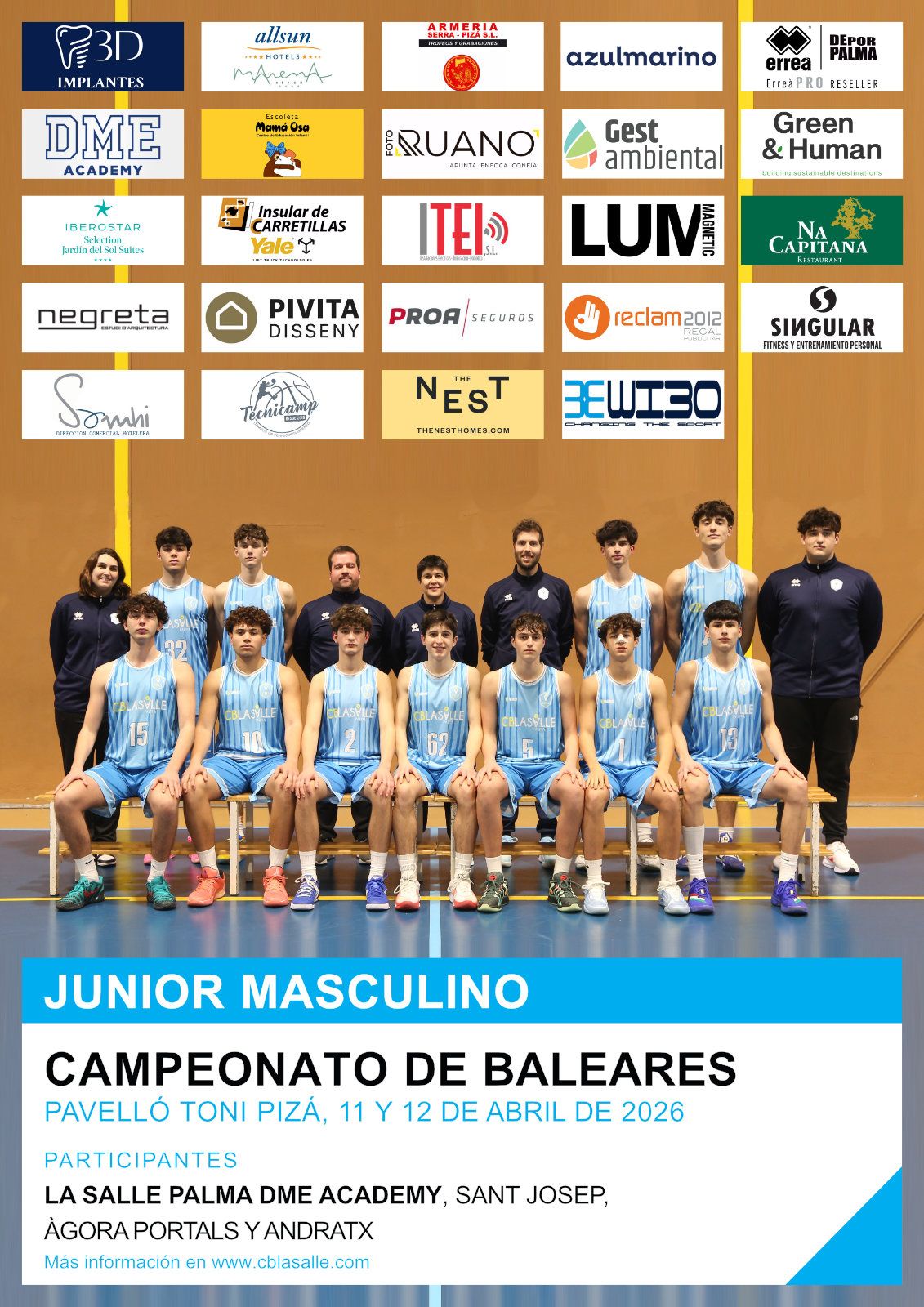 Nuestro equipo junior masculino La Salle DME Academy, entrenado por Carol Navarro y Marc Ferrer, participará los días 11 y 12 de abril en el Campeonato de Baleares que tendrá lugar en el pabellón Toni Pizá. El formato de competición será una final a cuatro en la que además de nuestro equipo participarán Andratx, Sant Josep y Ágora Portals.